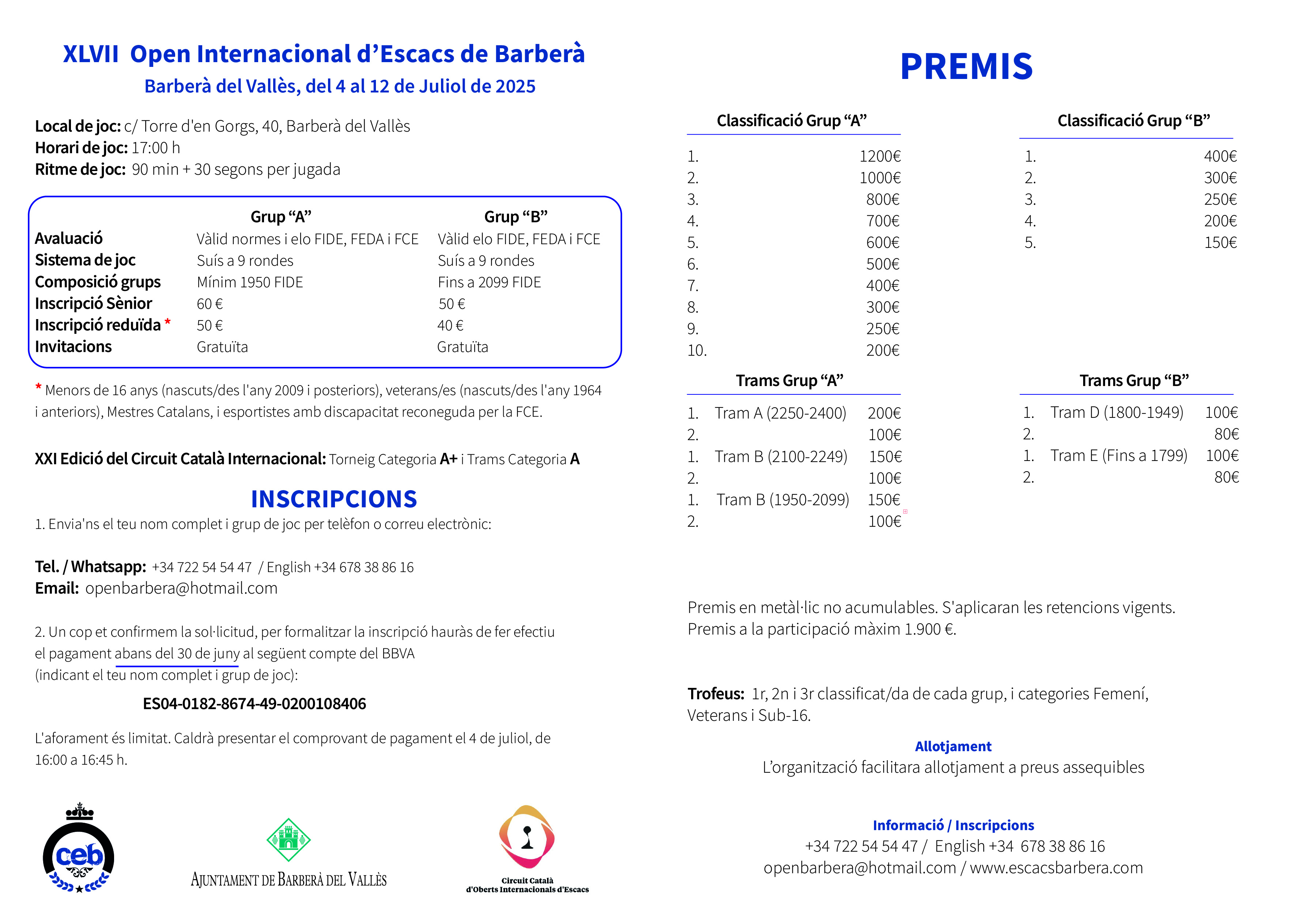 XLVII Open d’Escacs Barberà del Vallès Publicat perescacsbarberaMarç 16, 2025Març 16, 2025Publicat enAgenda, Open InternacionalEtiquetes:2025, ajedrez, barbera del valles, chess, escacs, internacional, Open Bases del Torneig Català Español English Comparteix això: Feu clic per compartir a X (S'obre en una nova finestra) X Feu clic per compartir al Facebook (S'obre en una nova finestra) Facebook M'agrada S'està carregant... Relacionats